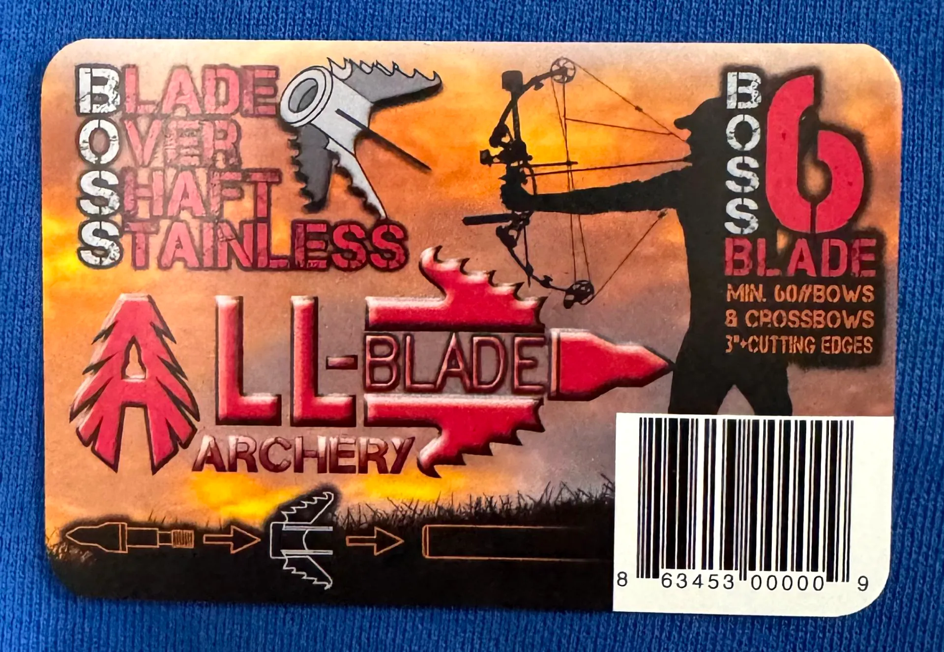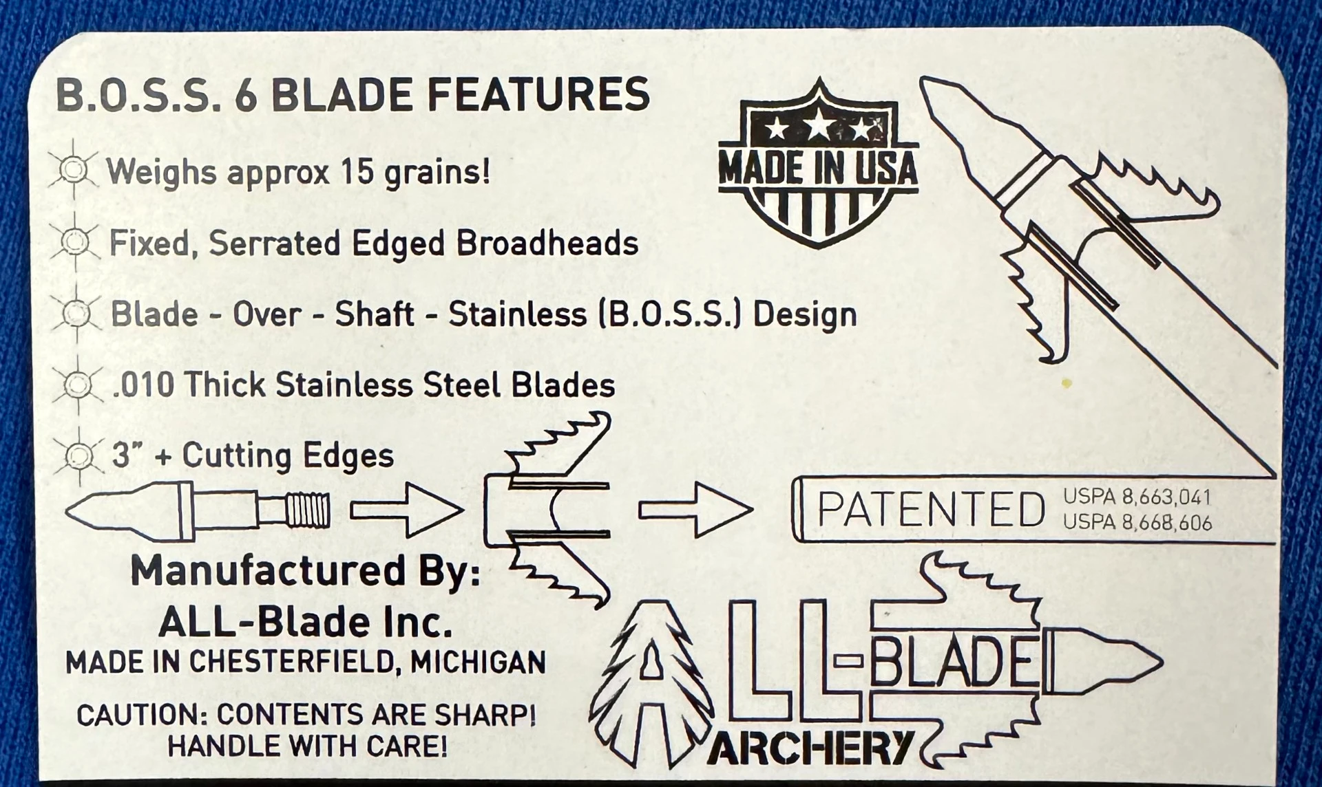 .010 Thick Stainless Steel Blades 3″ + Cutting Edges Manufactured By: ALL-Blade Inc. MADE IN CHESTERFIELD, MICHIGAN CAUTION: CONTENTS ARE SHARP! HANDLE WITH CARE! MADE IN USA PATENTED USPA 8,663,041 USPA 8,668,606 ALL-BLADE ARCHERY